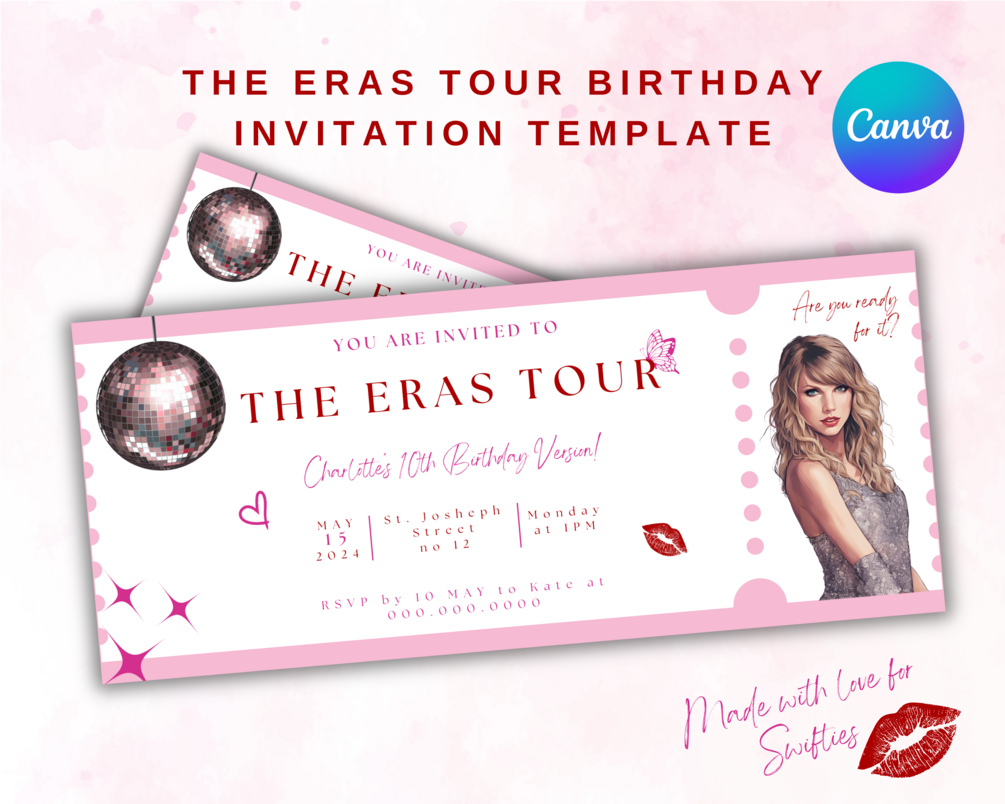 Dear Swiftie, can you think of anything better than a Taylor Swift ERAS TOUR invitation for your birthday?! You can easily customize this invitation template with a free Canva account. Let's throw our own Eras Tour party! Are you ready for it?
