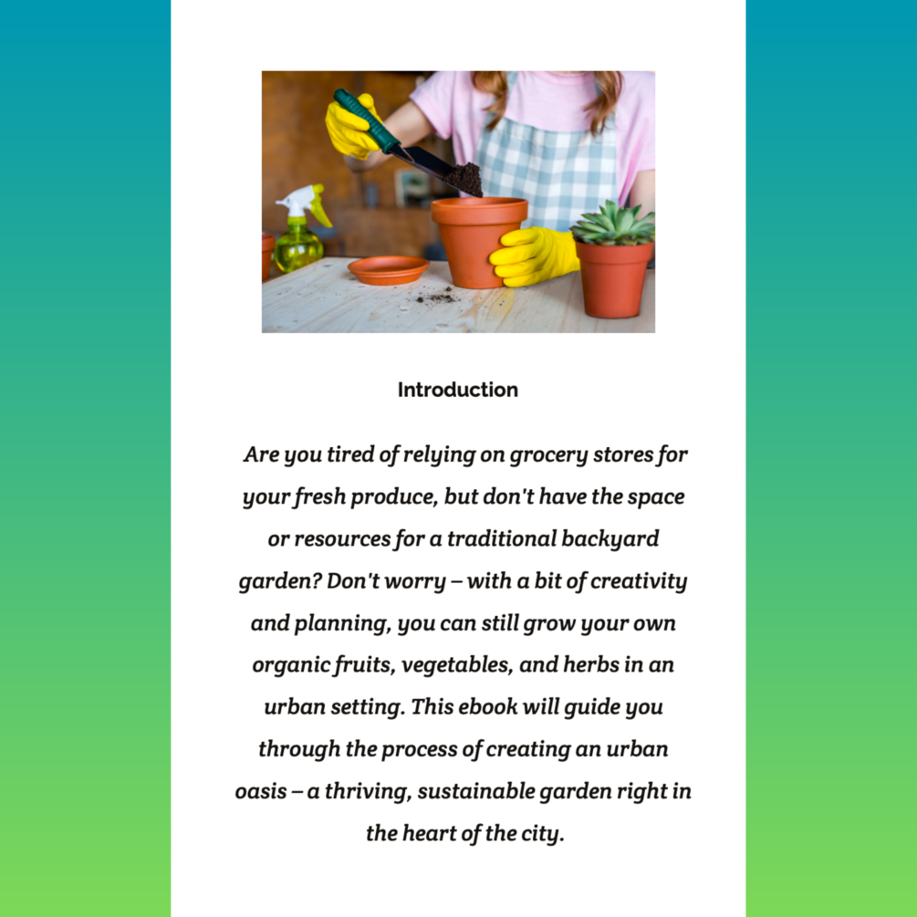 By following the tips and strategies outlined in this ebook, you can create a beautiful, productive, and sustainable organic garden in an urban setting. Whether you're a seasoned gardener or a complete beginner, Urban Oasis will provide you with the knowledge and inspiration you need to grow your own food and transform your city space into a thriving garden.